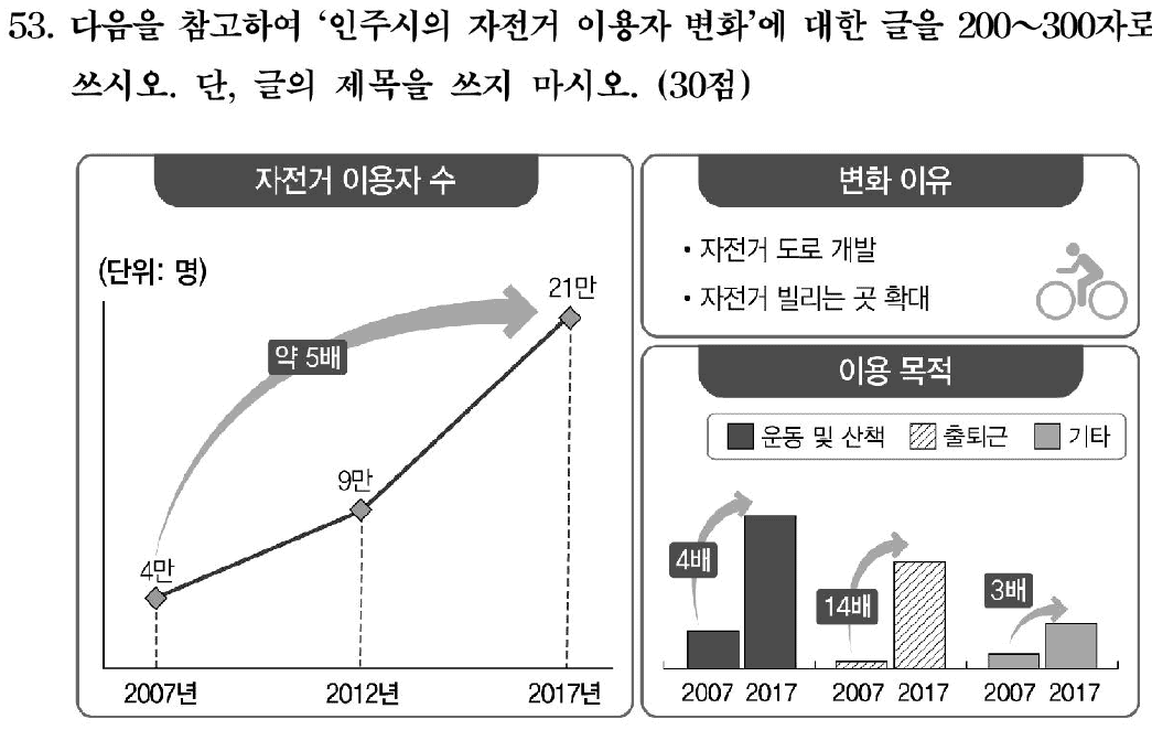 질문 : ‘인주시의 자전거 이용자 변화’ 에 대한 글을 쓰라는 문제입니다. 그리고 ‘자전거 이용자 수’, ‘변화 이유’, ‘이용 목적’ 세 가지 자료가 문제에 있어요. 주제는 무엇인지, 어떤 내용을 어떤 순서로 써야 하는지 생각해보고 글을 써 봅시다. 단위, 수치, 변화 표현, 단어를 문장으로 바꾸기 등을 잘 생각해서 글을 쓰세요.